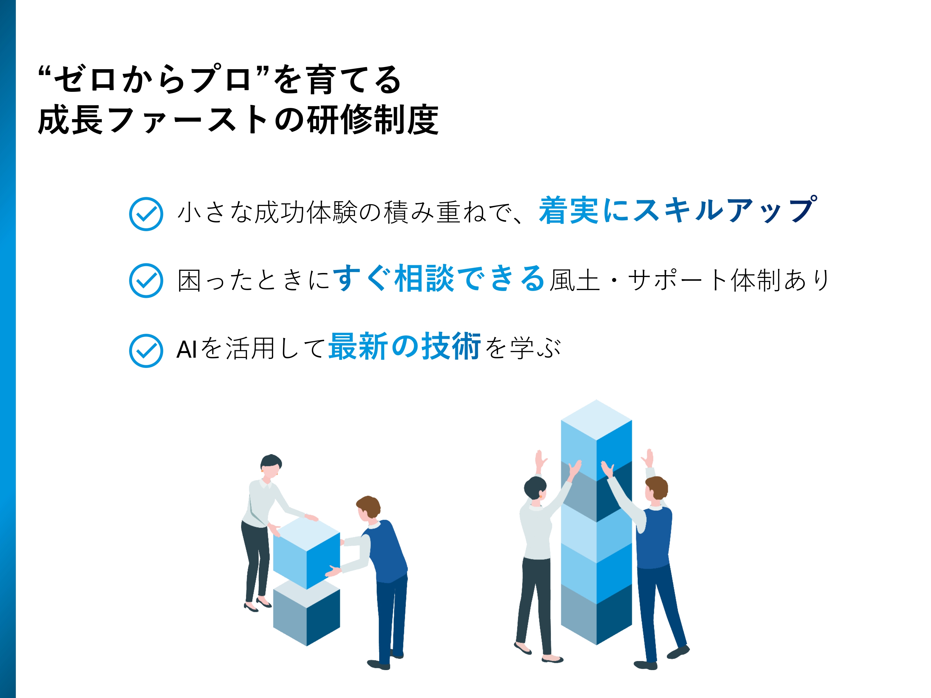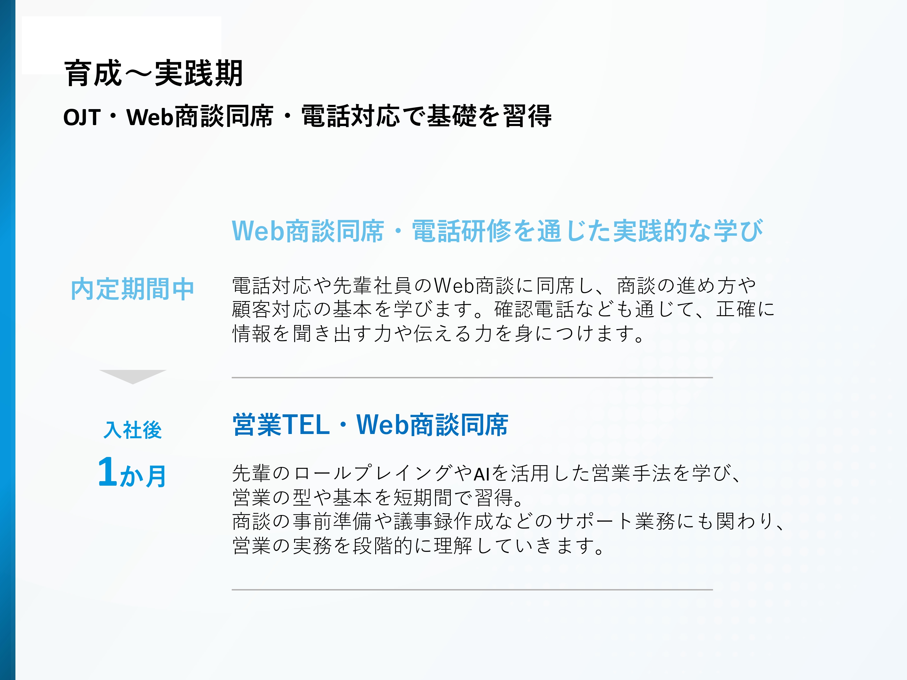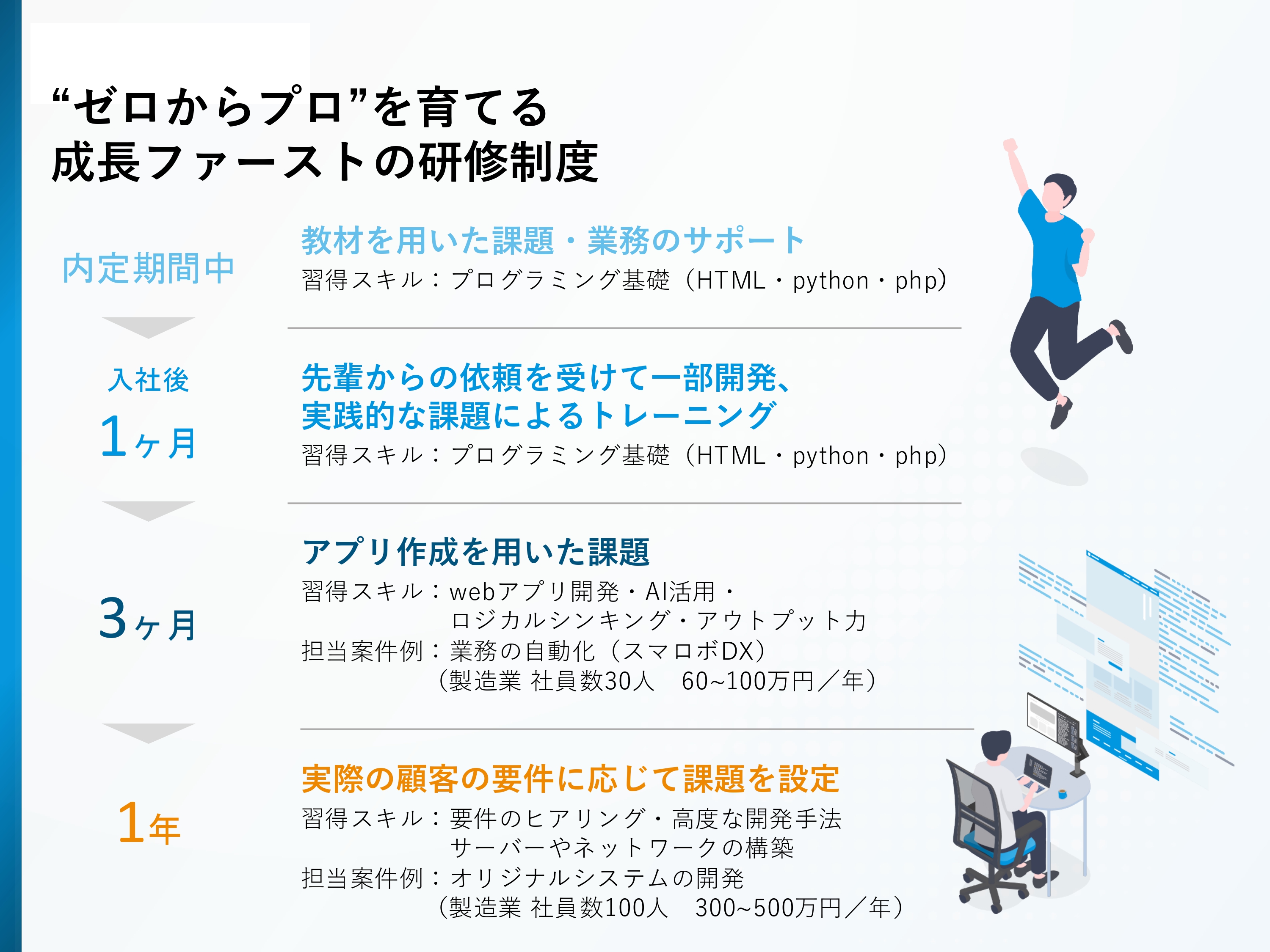 その後の研修は、業務内容や本人の成長角度によってカスタマイズされます。