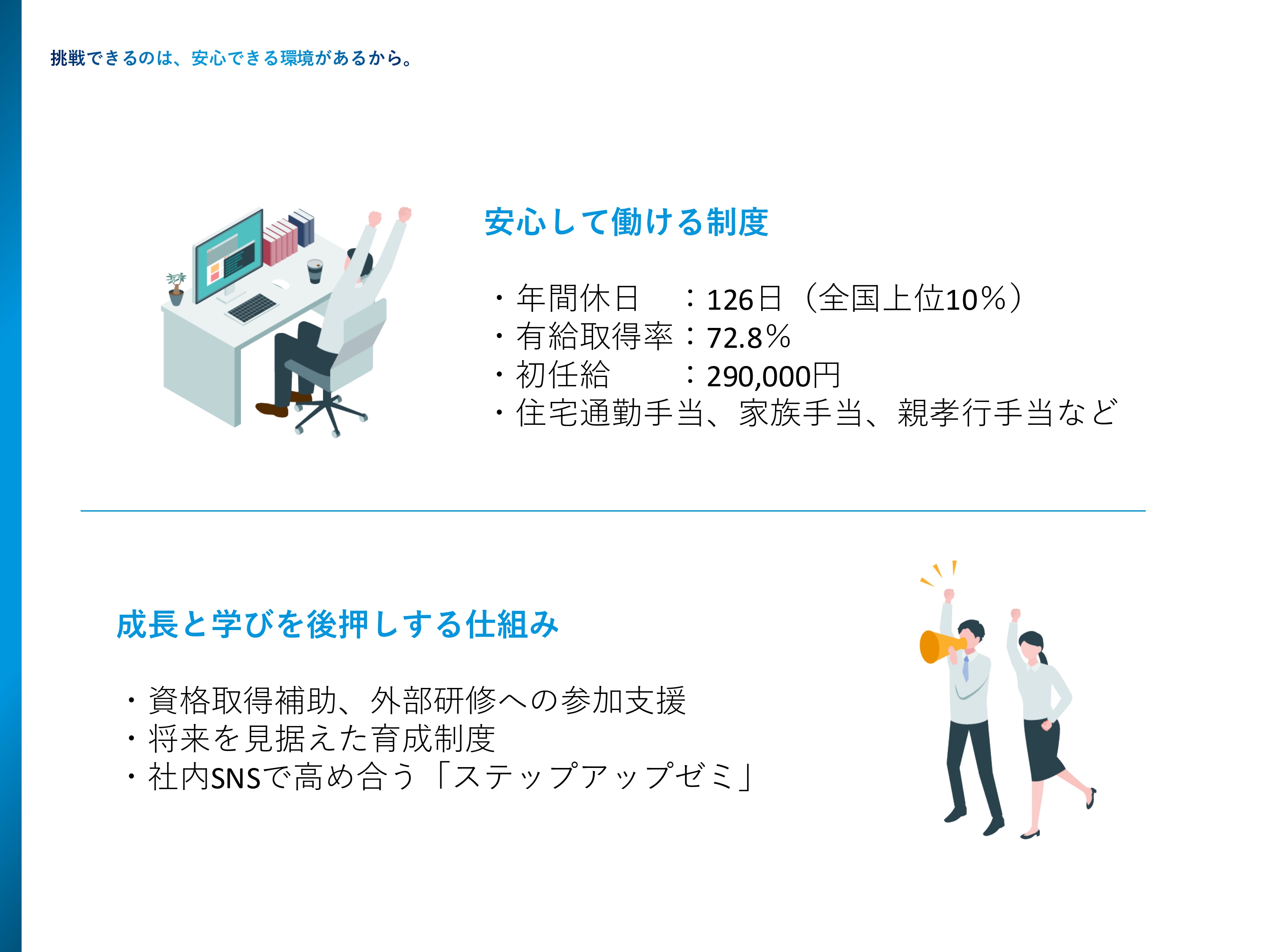 各種労働法を順守し、業界や地域の相場感、現状の給与水準などを総合考慮し、安心して生活ができる基本給を支給します。 現状、愛知県庁と同等以上の金額です。20代のうちに、結婚し、出産、マイホームを購入する社員もいます。 一般社員の場合、最長30歳までは自動的に昇給します。管理職に昇格(平均昇格年齢27歳)後は、会社への貢献度に応じて、昇給していきます。